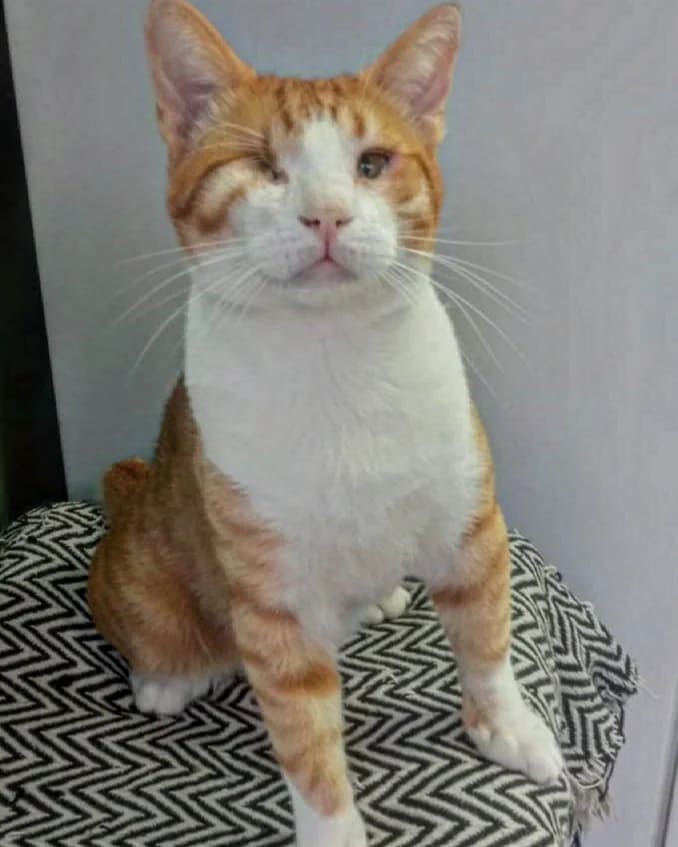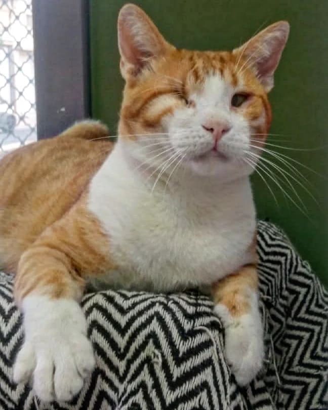 FIV positiv, halbes Schwänzchen, Zahnsanierung ist erfolgt, linkes Auge entfernt